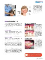 実践臨床マニュアルインプラント周囲病変を予防する コントロールする つづいて、口腔内の診査を行います。診査内容としては、①よく見る(視診)、②触れてみる(触診)、③プロービング、④エックス線写真でインプラント内部を確認する(読影)、以上の4つとなります。よく見る(視診) 視診では、口腔内全体の天然歯および歯肉、インプラント上部構造、周囲粘膜の状態を視て、発赤・腫脹などの炎症兆候や磨耗・損傷がないか確認します(図6)。触れてみる(触診) 触診では、まずインプラントの上部構造に触れて、動揺がないかどうかをチェックします。インプラントは、インプラント体、アバットメントスクリュー、補綴用スクリュー(スクリュー固定の場合のみ)というスクリューの連続で成り立っています。このうちのどこか1点に荷重がかかり、回転する力が加わると、ゆるみが生じ、上部構造が動揺してしまいます。この場合は、担当歯科医師に調整を依頼しましょう。 次に、インプラント先端部から歯槽頂に向かって粘膜を軽く押していきます。もしも内部で感染による炎症があれば、粘膜の付着部分から出血・排膿がみられます(図7)。天然歯と違い、それほど顕著な発赤・腫脹がなくても出血・排膿がみられることもありますので、必ず触診してください。図5 噛み癖のチェック7時と11時の位置に立ち、手のひら全体を患者さんの口腔周囲にあて、開閉運動および側方運動をしていただき、筋肉の発達や顎関節のクリックの有無などをチェックする。特に咬筋・口輪筋・頬筋は顔貌にも影響するので、その起始・停止についても理解しておく。あまり強く粘膜を押してしまうと、周辺に膿を散らしてしまいます。スーッと軽く触れる程度にしましょう。注意!口腔内を診査するその2口角下制筋小頬骨筋頬筋笑筋前頭筋皺眉筋眼輪筋大頬骨筋咬筋口輪筋aは初診時の状態(他院でインプラントを埋入している)、bは炎症が少し落ちついた状態。インプラント治療後のセルフケアでは、上部構造と粘膜との境界部分を清掃し、プラークが蓄積しないようにする必要があるが、上部構造だけを清掃していると粘膜が発赤・腫脹する。歯ブラシをあてる範囲を拡大するよう指導し実践してもらうと、少しずつ腫脹が治まってくる。図6 インプラント周囲粘膜の炎症図7 粘膜からの排膿インプラント体がP.g.菌やA.a.菌などの歯周病菌に感染している場合、プローブを抜いたりインプラント先端から歯槽頂へ側方圧を加えた際にポケット部分から排膿してくる。これは炎症兆候として患者さんに認識していただかなければならないため、写真を見せながら患者さんに説明する。ab39歯科衛生士 Vol.38 April 2014