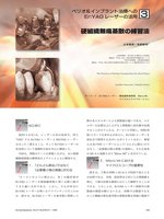 135硬組織無痛蒸散の練習法山本敦彦/吉野敏明*大阪府開業 (医)成仁会 藤沢台 山本歯科連絡先:〒584‐0071 大阪府富田林市藤沢台5‐4‐16*神奈川県開業 吉野歯科診療所連絡先:〒220‐0004 神奈川県横浜市西区北幸1‐2‐13 横浜西共同ビル5FThe Practice of Painless Transpiration for Hard Tissue Atsuhiko Yamamoto, Toshiaki Yoshinoキーワード:Er:YAGレーザー,硬組織無痛蒸散,Micro MI,マイクロエクスプロージョン際の各エネルギーによる蒸散面の違いである.エネルギーを必要以上に上げると蒸散面に炭化層が出現することがみてとれる.タービンに対抗し,切削(蒸散)スピードを求めるがゆえに,Er:YAGレーザーを高出力で使用する方がいるがメリットはない.筆者らはEr:YAGレーザーによって「どんどん削る」のではなく,「必要最小限の蒸散」を提唱し,それを従来のMIから発展させた“Micro MI”と名付けている.2.Micro MIにおけるマイクロスコープの重要性 図2は,う窩を肉眼(1倍)および20倍で見たときの比較である.当然,高倍率ほど目に入る情報量も増え,う窩の状態を細部にわたって観察することができる.このことは,Er:YAGレーザー照射中の蒸散面の確認の際にもいえる.肉眼では確認できなかった微細な軟化象牙質の蒸散状態を詳細に確認ではじめに 前回(5月号)は,レーザーの名の由来や,同じ“YAG”でもEr:YAGレーザーとNd:YAGレーザーはまったく異なること,そしてEr:YAGレーザーの安全性について基礎的な話を中心に解説した. 今回は,実際のケースを供覧しながら,主に硬組織無痛蒸散の練習法をイラストとともに解説する.1.「どんどん削る」ではなく「必要最小限の蒸散」が大切 「タービンのように削れる」,多くの臨床家がEr:YAGレーザーを硬組織蒸散に用いる際に掲げてきた謳い文句である.しかし,それが本当にEr:YAGレーザーを用いるアドバンテージだったのか.図1は,Er:YAGレーザーを象牙質に照射した3ペリオ&インプラント治療へのEr:YAGレーザーの活用the Quintessence. Vol.31 No.6/2012̶1305